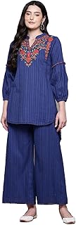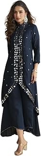 Navy Blue Mirror Work Kurti, Asymmetric Designer Long Dress with Mandarin Collar, 3/4 Sleeves