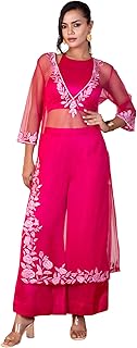 Pink Raw Silk Blouse with See-Through Net Kurta and Pant | Luxurious Fabrics | Machine Embroidery | Regular fit Dress for Women