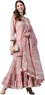 Pink Floral Hand Block Printed Kurta Sharara Set with Dupatta