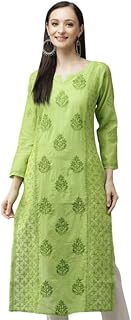 Women Chanderi Straight Fit Hand Embroidered Lucknowi Chikankari Straight Kurta Kurti A411314 Green