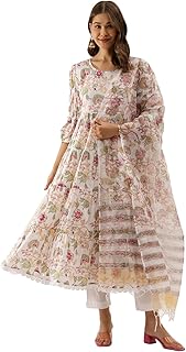 White Handblock Floral Printed Cotton Anarkali Kurta Set with Kota Doria Dupatta