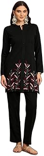 Women's Wool Blend Kurti and Pant Set, Floral Embroidered Winter Wear, Full Sleeve winter wear (IN, Alpha, L, BLACK)