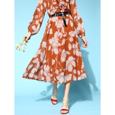 Women Floral Print Flared Brown Skirt