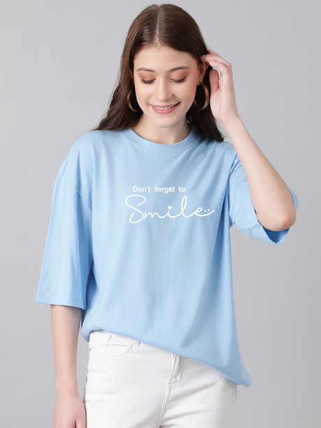 Women Printed Round Neck Cotton Blend Light Blue T-Shir...