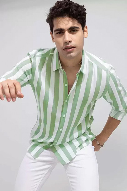 Men Slim Fit Striped Spread Collar Casual Shirt