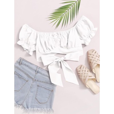 Women's & Girls' Tied Hem Puff Sleeve Slim Fit Crop Top