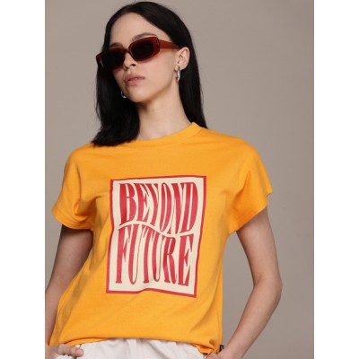 Women Typography Round Neck Cotton Blend Yellow T-Shirt