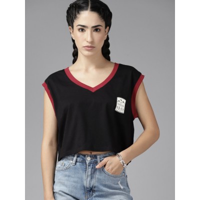 Women Printed Round Neck Pure Cotton Black T-Shirt