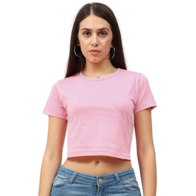 Women Solid Round Neck Cotton Blend Pink T-Shirt