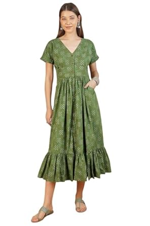 Women's 100% Cotton Green Midi Dress