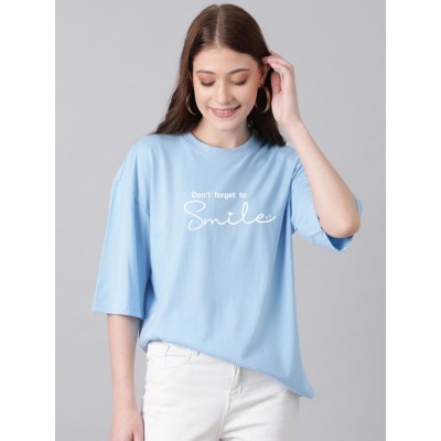 Women Printed Round Neck Cotton Blend Light Blue T-Shir...