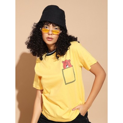 Women Graphic Print Round Neck Pure Cotton Yellow T-Shi...